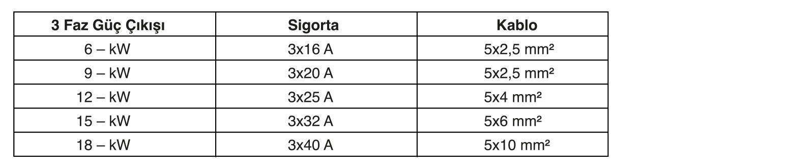 Aşağıda verilen tabloda ısıtıcının gücüne göre şebekeden çekeceği akım değerleri gösterilmiştir. Isıtıcıyı kontrol etmek için bağlayacağınız kontaktörü ve enerji girişi kablosunu bu değerleri göz önünde bulundurarak seçmeniz gerekmektedir.