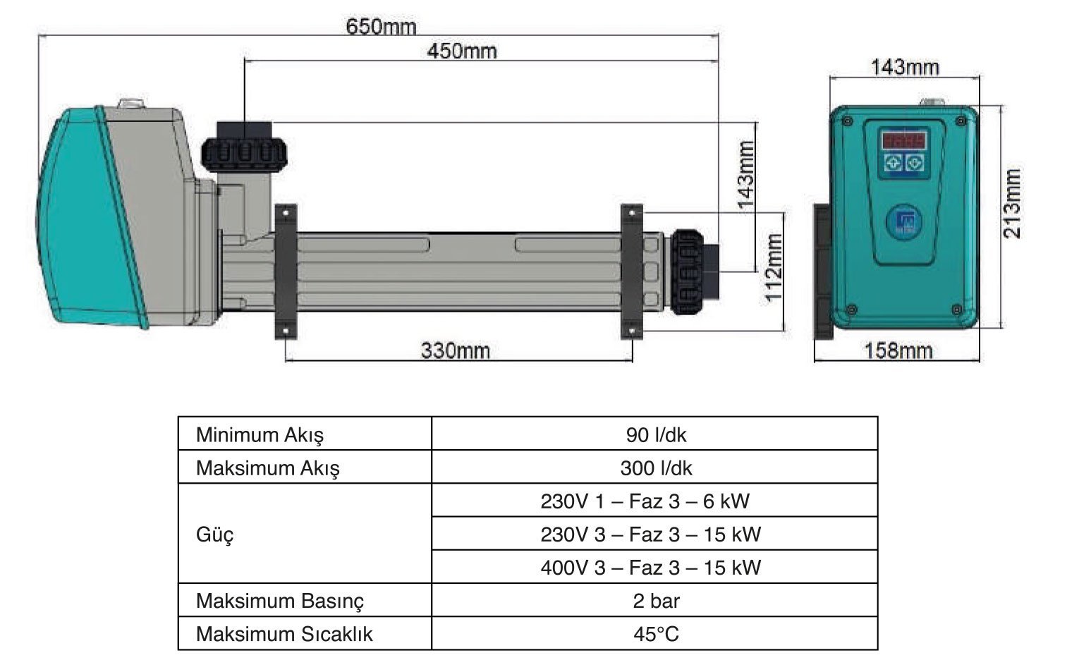 • Kontaktör ve gerekli devre elemanlarını içeren, sayısal göstergeli kontrol paneli ile monoblok