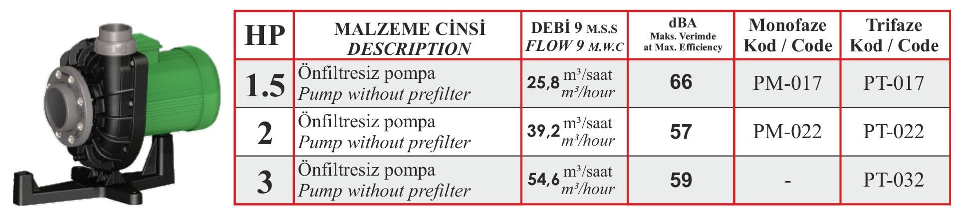 - Monofaze: 220V 50 Hz 1450 devir/dakika