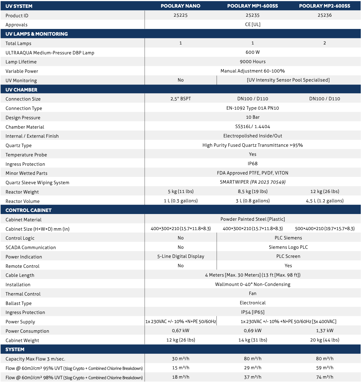 CFD ile optimize edilmiş lamba yerleşimine sahip kompakt reaktör tasarımı sayesinde POOLRAY™, tüm UVT aralığı boyunca minimum basınç kaybı ile maksimum hidrolik verimlilik sağlar. Bu yapı, sistemi kombine klor giderimi için ideal hâle getirir.
