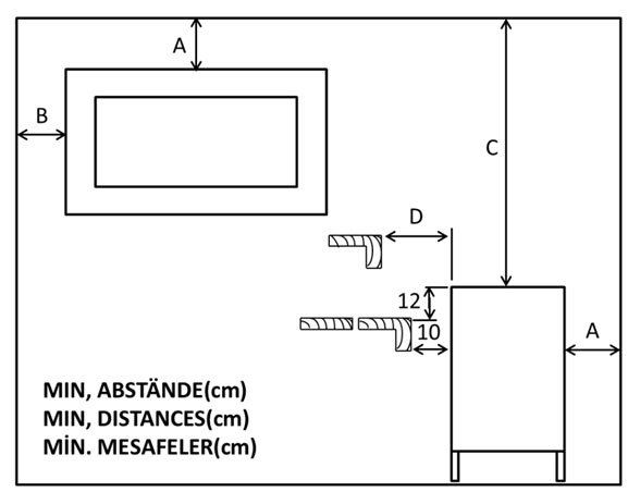 Önden: 10 cm Yanlardan: 20 cm Tavandan: 150 cm Arkada: 20 cm Isı Yalıtımı veya Taş Duvar |